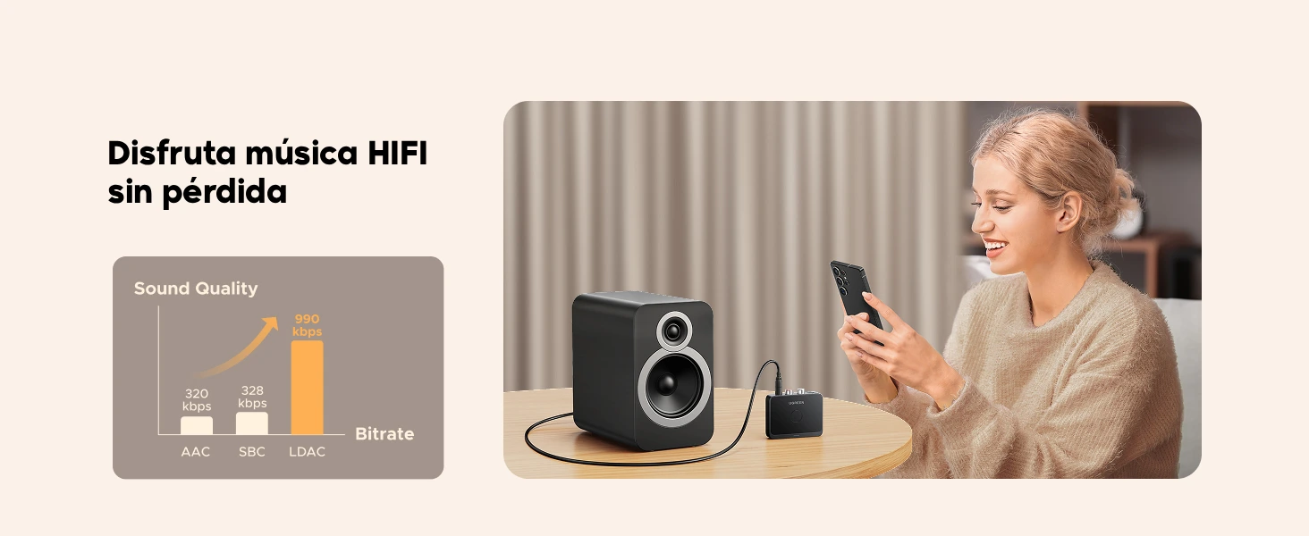 R: LDAC tiene mayores requisitos en cuanto a distancia de conexión y entorno. Por favor, selecciona una tasa de bits adecuada en tu teléfono según tu entorno actual. Si hay obstáculos cercanos o la distancia entre el producto y tu teléfono es relativamente larga, se recomienda cambiar a una tasa de bits más baja para garantizar una reproducción de audio fluida y sin interrupciones.